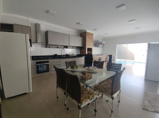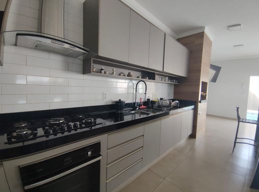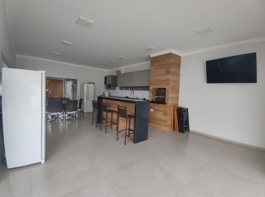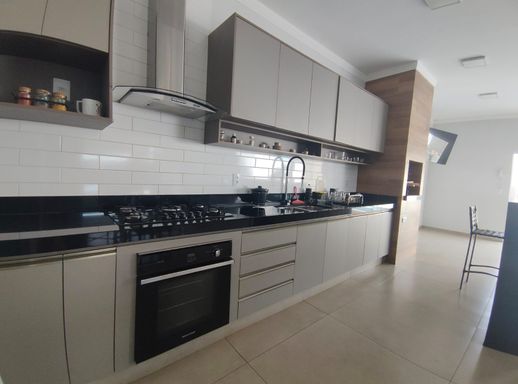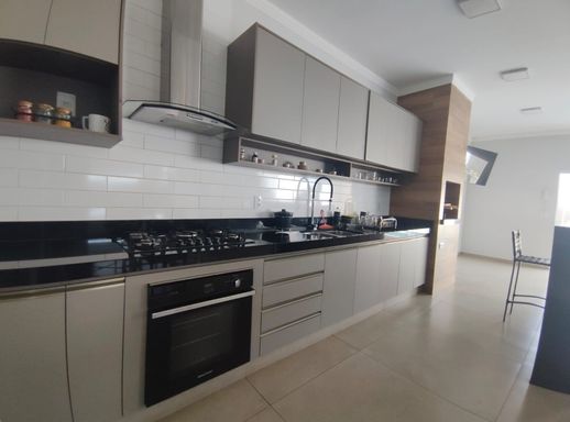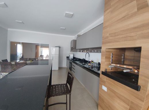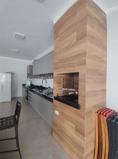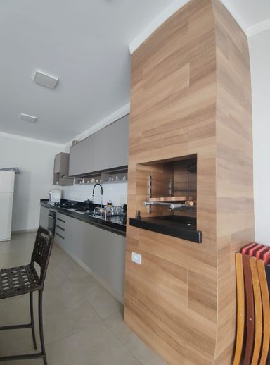 Cozinha gourmet com churrasqueira e ilha.